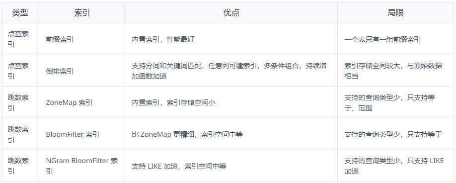 点查索引:常用于加速点查,原理是通过索引定位到满足 WHERE 条件的有哪些行,直接读取那些行。点查索引在满足条件的行比较少时效果很好。Apache Doris 的点查索引包括前缀索引和倒排索引: