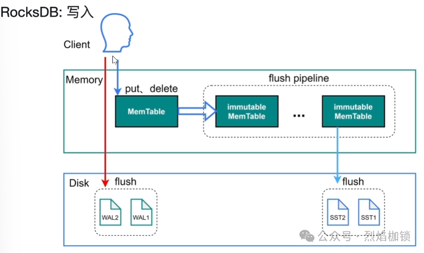 先写WAL(Write Ahead Log)预写日志,再写入内存MemTable。