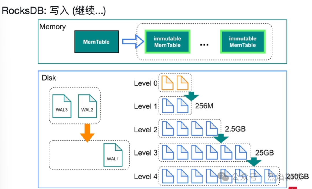 当 MemTable 达到一定大小后,会转化为 Immutable MemTable。Immutable MemTable 是将 MemTable 转为磁盘上的 SSTable 的一种中间状态。在转化过程中,写操作由新的 MemTable 处理,过程中不阻塞数据更新操作。