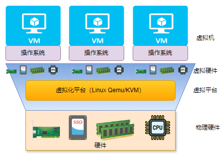 前文我们对云计算的整体架构进行了介绍,并且了解到云计算的核心是虚拟化技术。这里的虚拟化技术包括计算虚拟化、网络虚拟化和存储虚拟化等技术。以基于Linux操作系统的虚拟化为例,通常在物理机上安装Linux操作系统和虚拟化软件,然后基于虚拟化软件创建虚拟机,并在虚拟机中按照操作系统。简而言之,虚拟化可以认为是通过软件虚拟出CPU、内存和硬盘等硬件,并在其上运行操作系统,具体如下图所示。