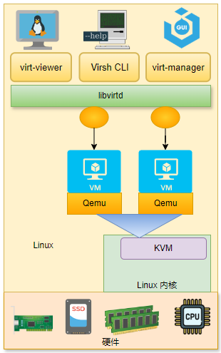 KVM:前文已经简要介绍过这个组件,KVM其实就是Linux内核的一个模块,它可以利用硬件的虚拟化特性实现高效的CPU和内存虚拟化。
