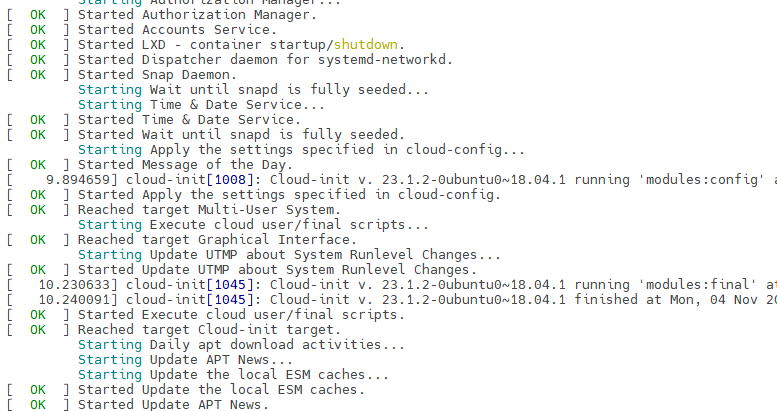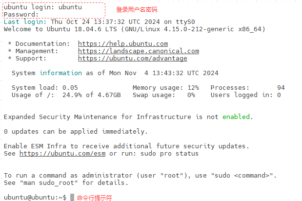 如下是到最后显示的登录提示信息及登录后显示的信息。登录是需要输入用户名ubuntu及密码。密码是文件user-data.txt中设置的内容,本文为111111。
