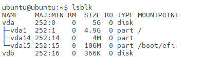 至此,一个虚拟机已经成功创建并运行起来了。可以看到通过qemu创建一个虚拟机非常简单。登录进去以后我们可以通过lsblk工具看一下虚拟机中的硬盘,可以看到有vda和vdb两个硬盘,其中vda是系统盘,大小是5GB;vdb大小是336KB,这个是我们前面创建的用于存储密码的硬盘。