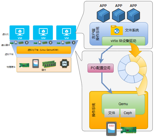 虚拟机也称为客户机,其上的操作系统称为客户机操作系统。基于我们前面部署的虚拟机,该虚拟机中块设备vd*是基于虚拟机特有块设备驱动(virio_blk.c)生成的,这个驱动称为前端驱动(front-end driver)。当虚拟机中的应用(APP)通过文件系统向硬盘发送写请求时,硬盘驱动会将数据放入一个环形缓冲区,同时通过PCI配置空间通知Qemu接收数据。在Qemu端也有对应的驱动,称为后端驱动(back-end driver),它接到通知后将环形缓冲区中的数据取出,并进行后续的操作。