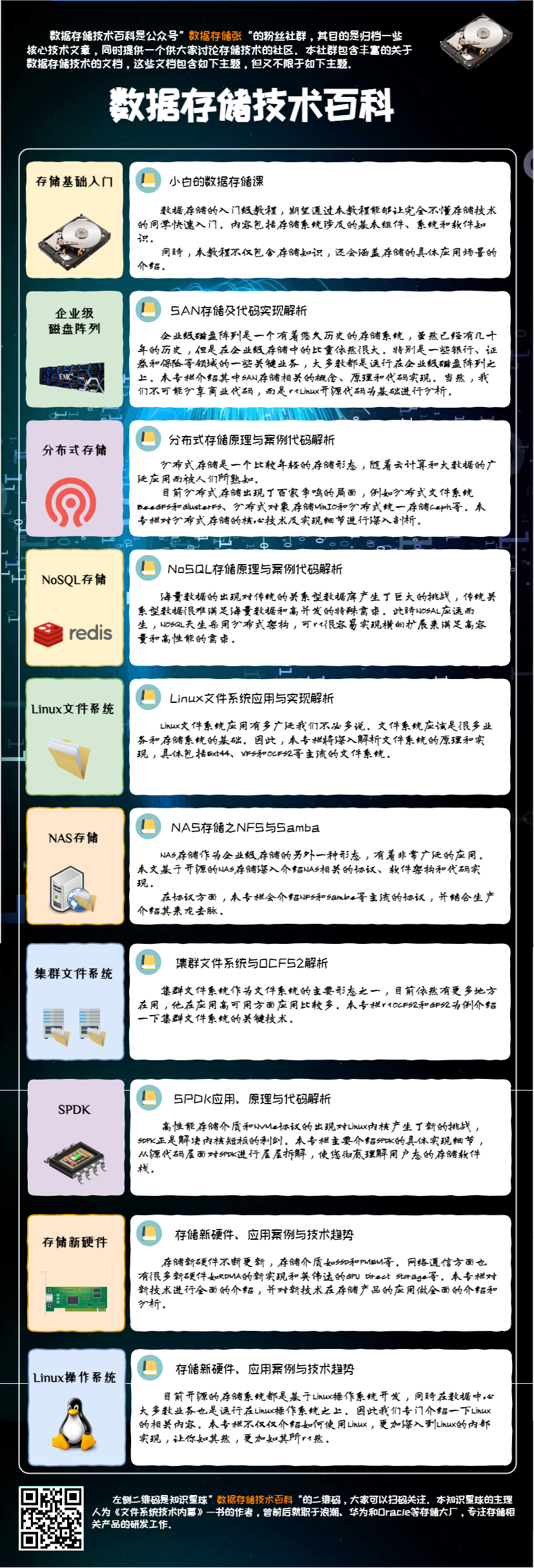 计算机数据存储简史,从纸到云的变迁 基于Fuse的最简单的文件系统 代码覆盖率测试,聊聊gcov和lcov SAN存储的概念与基于iSCSI的操作实战 全面了解SSD,SSD关键术语全面解析 分布式虚拟文件系统,数据编排小能手 高性能的基础RAID0,实操与代码实现解析 网络文件系统,年近五十岁,老当益壮 弹性空间之道,逻辑卷管理(LVM)技术 计算机数据存储简史,从纸到云的变迁 基于树莓派和硬盘柜搭建一个几十TB的家用NAS Linux存储软件栈到底有多复杂,存储软件栈全景概览 分布式存储的软件架构与案例解析 数万客户端NFS服务的困境,聊聊自动挂载技术 深入了解一下SSD的相关内容 什么是文件系统,以Linux中的Ext4为例细聊一下 对象存储,从单机到分布式的演进 为什么都说NFS读写性能差,如何进行优化?SPDK块设备抽象层bdev对多种后端模块(驱动)的支持 计算机的存储体系与性能金字塔 Linux是如何将硬盘展示给用户的,从物理设备到通用块层 聊聊ZFS文件系统,一个免费开源的存储引擎 云计算的出现与存储系统形态的改变 分布式数据路由的基石,聊聊一致性哈希算法 如何创建一个比物理空间大的卷 ,聊聊自动精简配置 介绍一款免费开源的企业级存储软件 企业级磁盘阵列软件架构与功能概述 高性能存储的基础,了解一下内存的方方面面 介绍几个学习存储通信协议的利器 从电商系统认识数据与数据的存储
