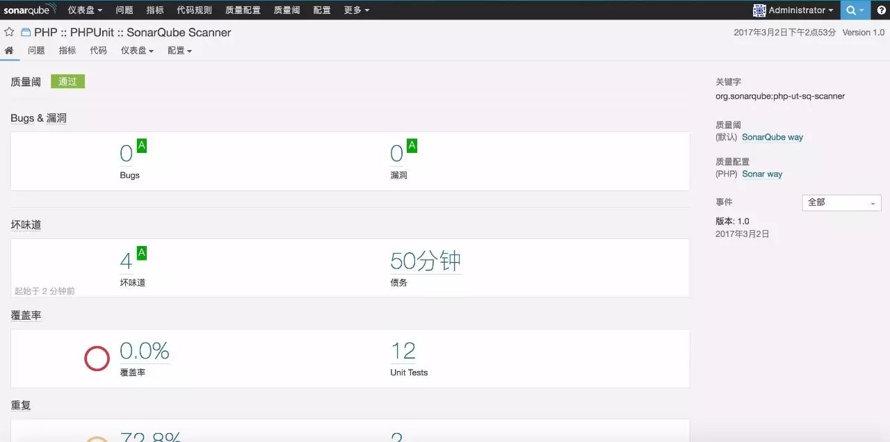 cd /data/db/sonar-examples-master/projects/languages/php/php-sonar-runner-unit-tests vim sorna-project.properties sonar.projectKey=org.sonarqube:php-ut-sq-scanner # sonar中的key,必须唯一。 sonar.projectName=PHP :: PHPUnit :: SonarQube Scanner ##在sonar中展示的名称 sonar.projectVersion=1.0 ##项目版本 sonar.sources=src ##源码路径 sonar.tests=tests sonar.language=php ##源码语言 sonar.sourceEncoding=UTF-8 ##源码编译方式 # Reusing PHPUnit reports sonar.php.coverage.reportPath=reports/phpunit.coverage.xml sonar.php.tests.reportPath=reports/phpunit.xml sonar.projectKey=org.sonarqube:example-it-jacoco-sonar-scanner sonar.projectName=Java :: IT Coverage with JaCoCo :: SonarQube Scanner sonar.projectVersion=1.0 sonar.sources=src sonar.binaries=classes sonar.language=java sonar.sourceEncoding=UTF-8 sonar.jacoco.itReportPath=reports/jacoco.exec