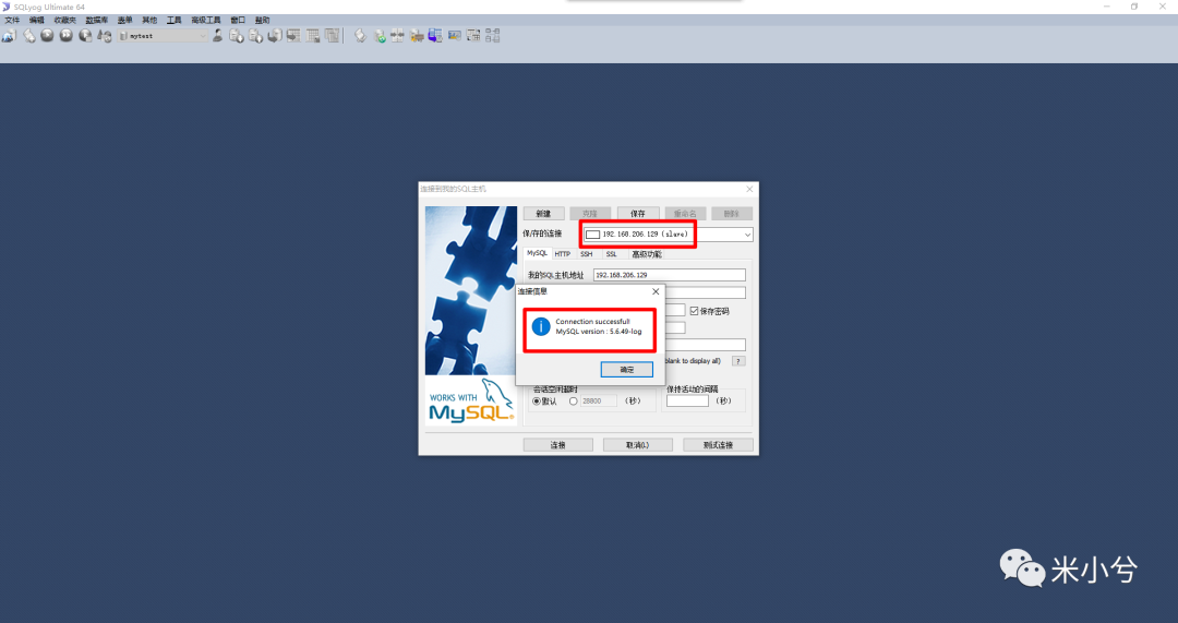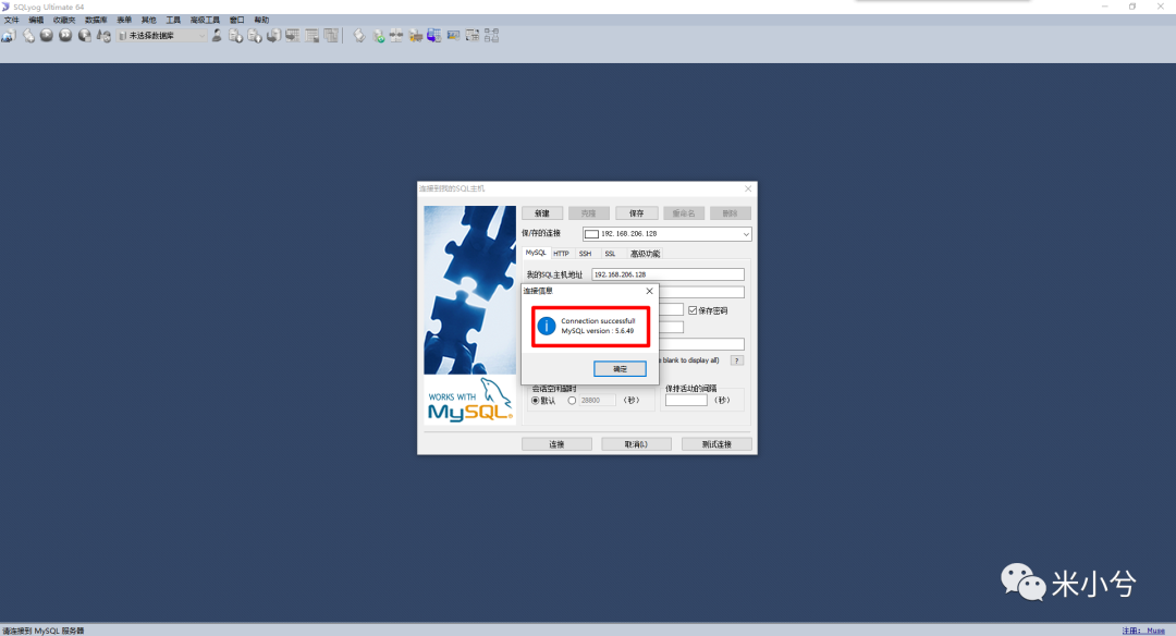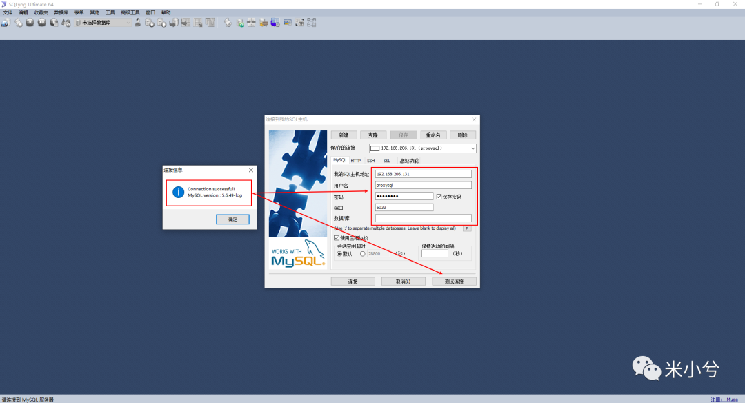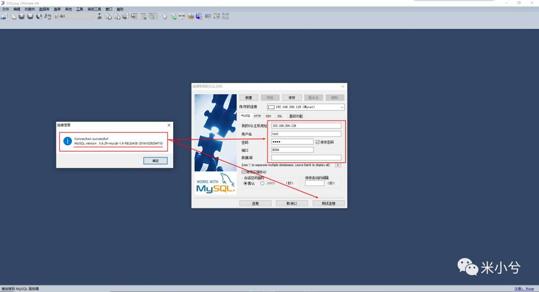 注意:在这里我使用图形化界面来操作,先测试是否连通,如果不能连上,请检查虚拟机防火墙是否关闭,那两个用户是否配对,如果Mycat重启不成功,请使用