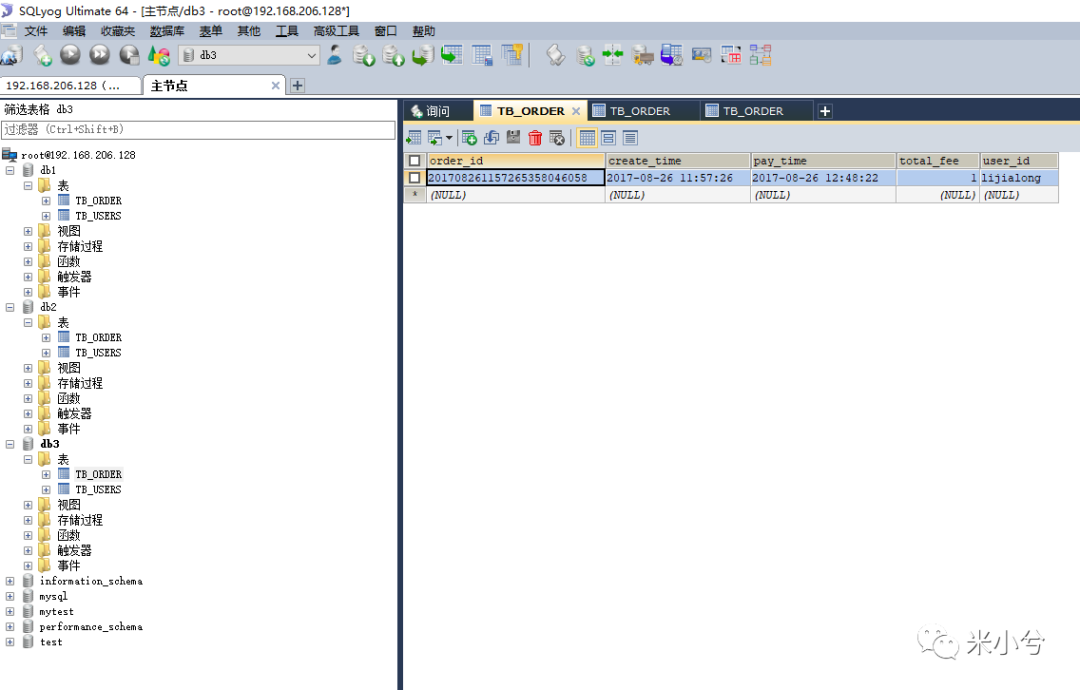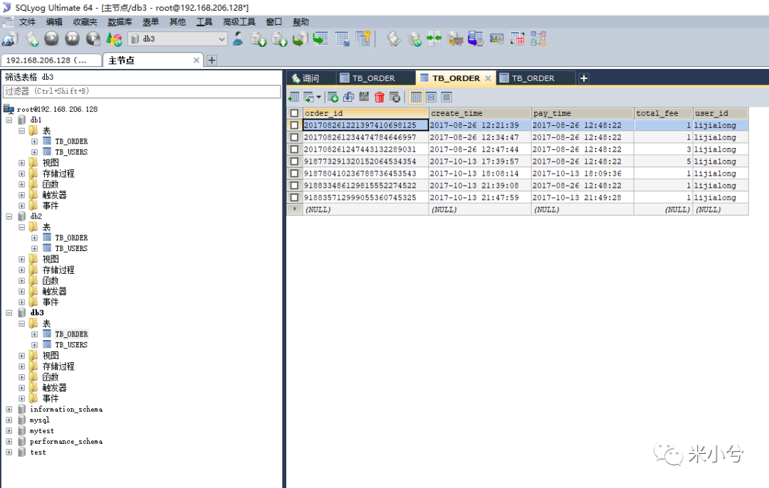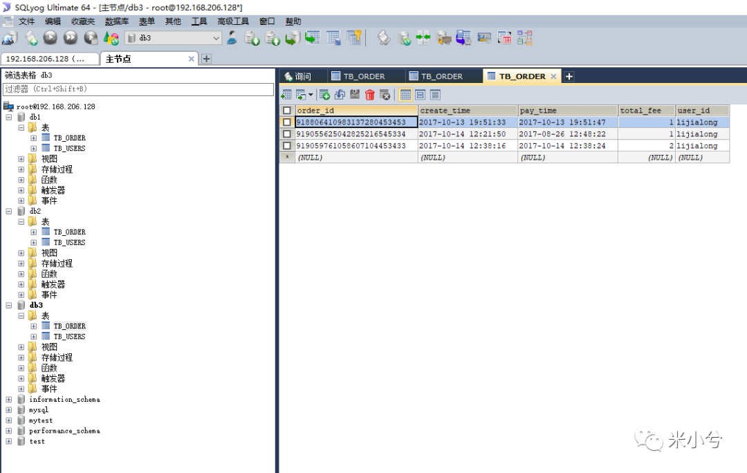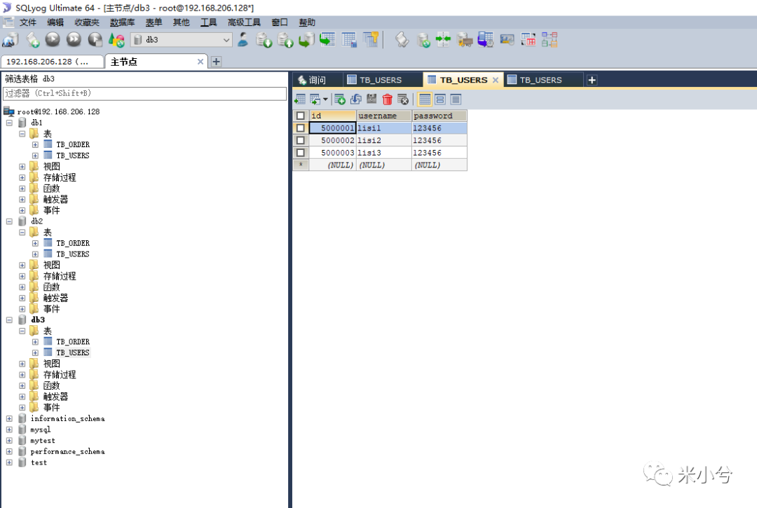 重开一个窗口,连接主节点,依次查看,db1、db2、db3上的TB_USERS、TB_ORDER,你会发现数据是均匀分布的,这就实现了我们最终的分片集群了,具体效果图如下: