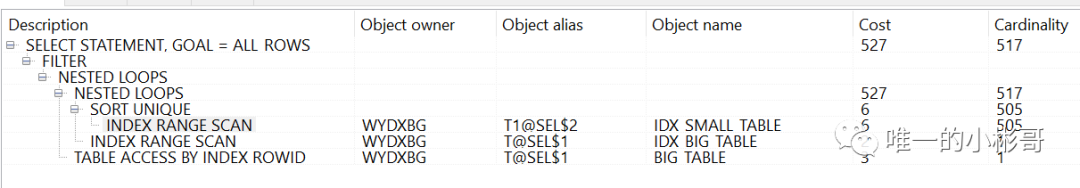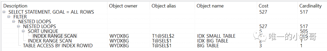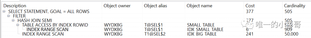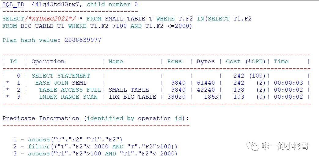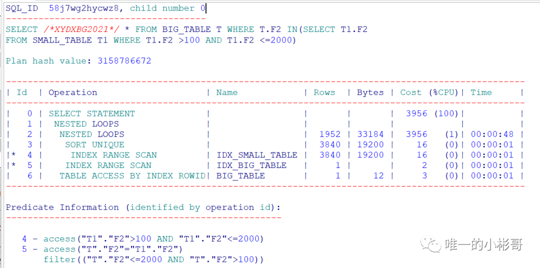 首先我们以BIG_TABLE作为主表,SMALL_TABLE作为子查询中的表,采用IN的写法,SQL语句如下: