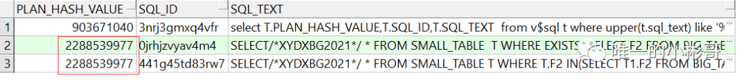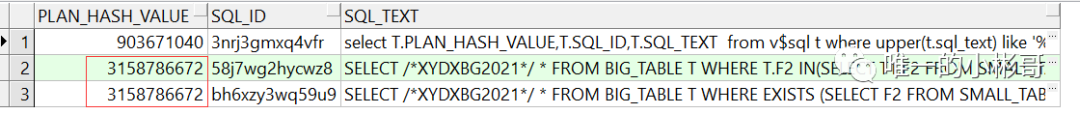 两个SQL的PLAN_HASH_VALUE一致,意味着使用的是相同的执行计划。