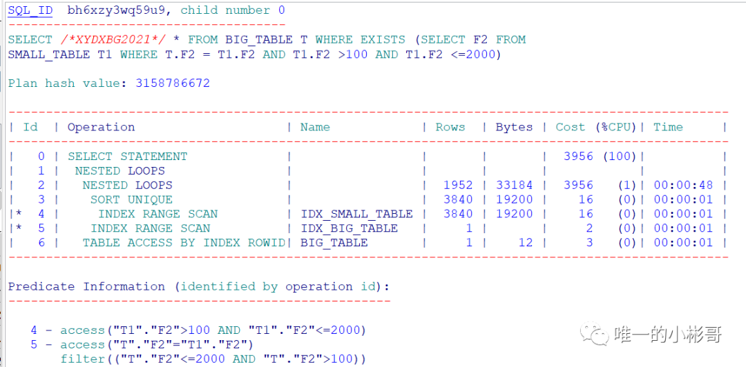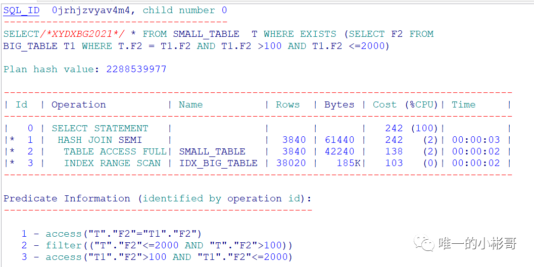 之后我们以BIG_TABLE作为主表,SMALL_TABLE作为子查询中的表,采用EXISTS的写法,SQL语句如下: