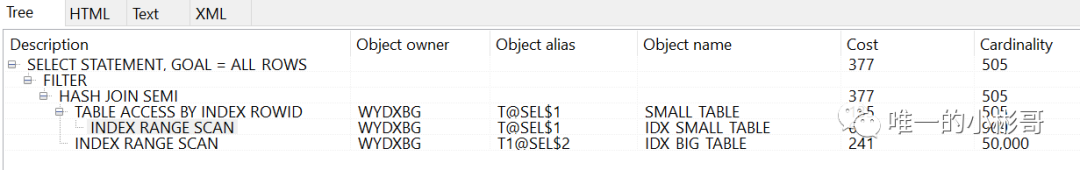 除了以上两个DEMO外,也可以验证两个表都用BIG_TABLE,以及都用SMALL_TABLE的例子,以及NOT EXISTS和NOT IN你会发现它们的执行计划也都是一样的。