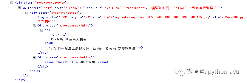 #获取每个div中的课程路径item['url'] = 'http://www.imooc.com' + box.xpath('.//@href').extract()[0]#获取div中的课程标题item['title'] = box.xpath('.//img/@alt').extract()[0].strip()#获取div中的标题图片地址item['image_url'] = box.xpath('.//@src').extract()[0]#获取div中的学生人数item['student'] = box.xpath('.//span/text()').extract()[0].strip()[:-3]#获取div中的课程简介item['introduction'] = box.xpath('.//p/text()').extract()[0].strip()