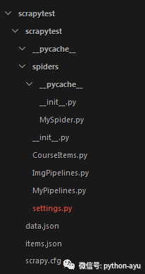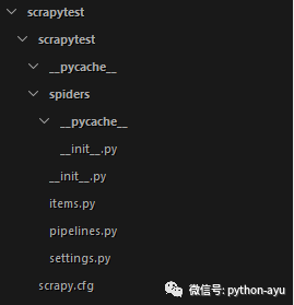 scrapy.cfg: 项目的配置文件scrapytest/: 该项目的python模块。之后您将在此加入代码。scrapytest/items.py: 项目中的item文件.scrapytest/pipelines.py: 项目中的pipelines文件.scrapytest/settings.py: 项目的设置文件.scrapytest/spiders/: 放置spider代码的目录.