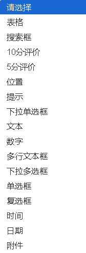 质流目前共实现了以下15类表单组件,其中表格、下拉单选框、单选框、复选框、位置、文本、时间、日期、附件这几类可以通过关键字配置即可。