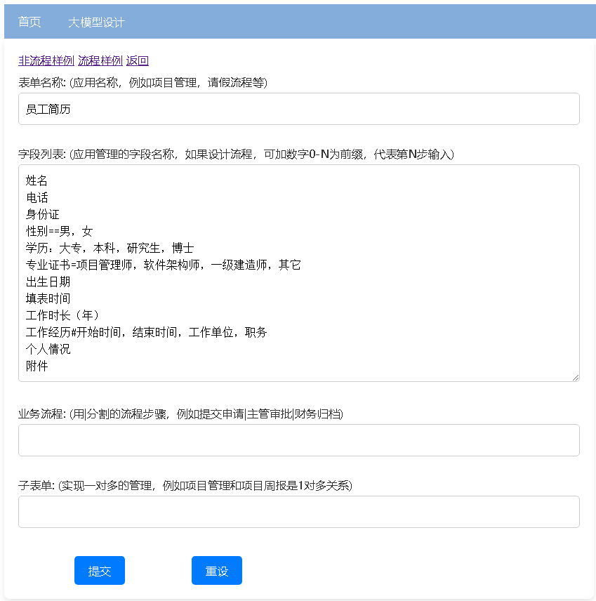 大模型设计可以快速生成表单和表单字段的设计数据,掌握大模型设计的关键字将更加精确的设计出自己想要的表单填写方式,例如性别可以设计为文本框自己填写,也可以设计为下拉框选择,最佳方式是实现单选按钮。