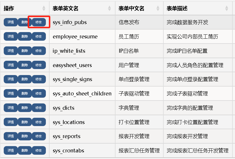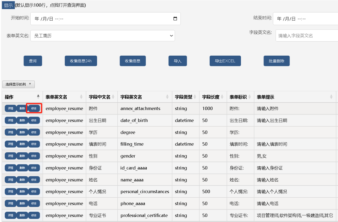表单的每个字段生成一条数据,可查找找到对应表单的所有字段,点击修改即可自行配置。