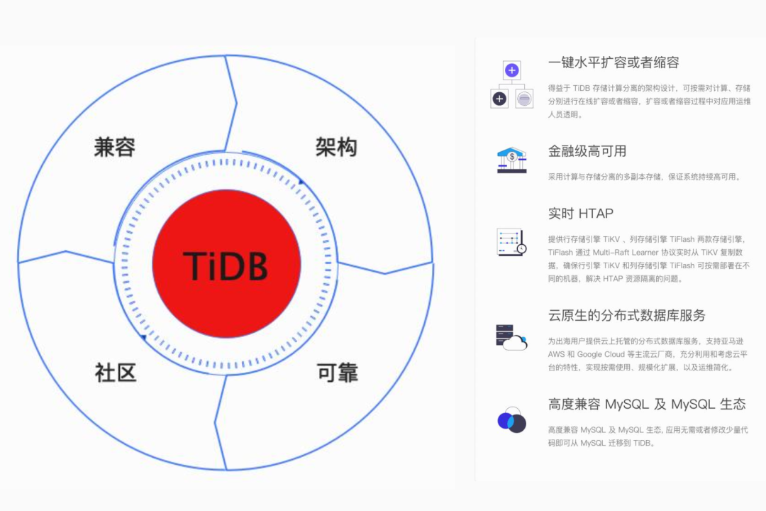 兼容性:鉴于 MySQL 在业务系统中的核心地位,TiDB 与 MySQL 的高度兼容性显得尤为重要。这种兼容性意味着现有的 MySQL 数据库可以较为轻松地迁移至 TiDB,从而降低了迁移风险和成本。同时,这种兼容性也便利了开发人员对 TiDB 的快速适应和使用,无需投入大量时间学习新的数据库操作和语法。