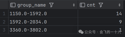 with dim as (select group_num, min_num + group_step * pos begin_num --区间开始, min_num + group_step * (pos + 1) end_num --区间结束, posfrom (select pos, group_num, group_step, min_numfrom (select--分组方法CEIL(1 + LOG(10, count_num) LOG(10, 2)) group_num,--极差/组数 =组距CEIL((max_num - min_num) CEIL(1 + LOG(10, count_num) LOG(10, 2))) group_step,min_numfrom (SELECT MAX(sales_number) max_num,MIN(sales_number) min_num,COUNT(*) COUNT_NUMFROM sales) t) tlateral view posexplode(split(space(cast(group_num as int) - 1), space(1))) tmp as pos, value) t)select concat_ws('-', cast(b.begin_num as string), cast(b.end_num as string)) group_name, count(*) cntfrom dim bleft join sales aWHERE a.sales_number >= b.begin_numAND a.sales_number < b.end_numGROUP BY concat_ws('-', cast(b.begin_num as string), cast(b.end_num as string))