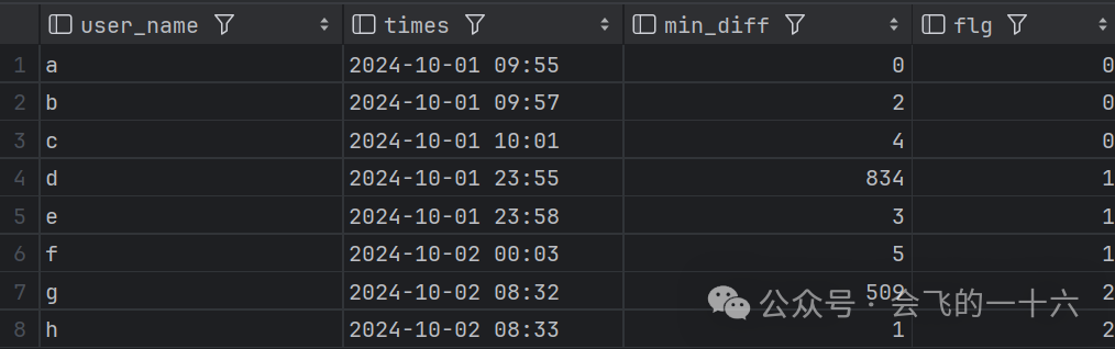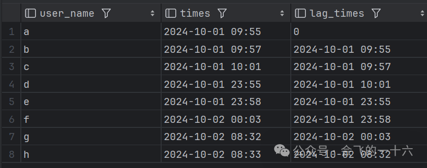 create table user_login as(select stack(8,'a', '2024-10-01 09:55','b', '2024-10-01 09:57','c', '2024-10-01 10:01','d', '2024-10-01 23:55','e', '2024-10-01 23:58','f', '2024-10-02 00:03','g', '2024-10-02 08:32','h', '2024-10-02 08:33') as (user_name, times))