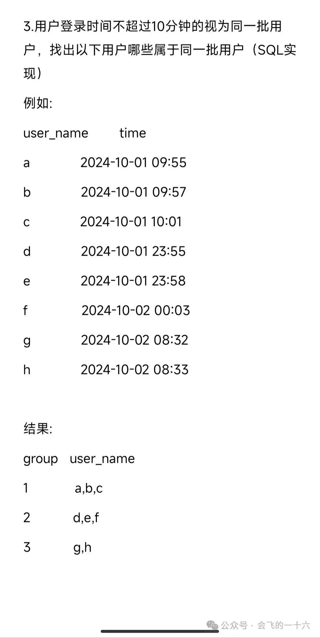 select grp + 1 grp,concat_ws(',',collect_list(user_name)) user_namefrom(select user_name, times, min_diff, sum(case when min_diff < 10 then 0 else 1 end) over (order by times) grpfrom (select user_name, times, NVL((unix_timestamp(times, 'yyyy-MM-dd hh:mm') - unix_timestamp(lag_times, 'yyyy-MM-dd hh:mm')) 60,0) min_difffrom (select user_name, times, lag(times, 1, 0) over (order by times) lag_timesfrom user_login) t) t) tgroup by grp