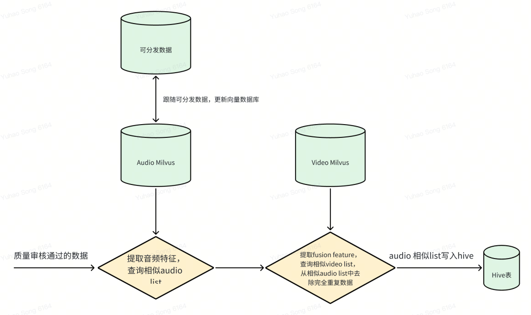将平台受欢迎的魔性音乐或者拍同框视频中的音乐特征提取后进行embedding,结构化的数据存在Milvus向量数据库中;