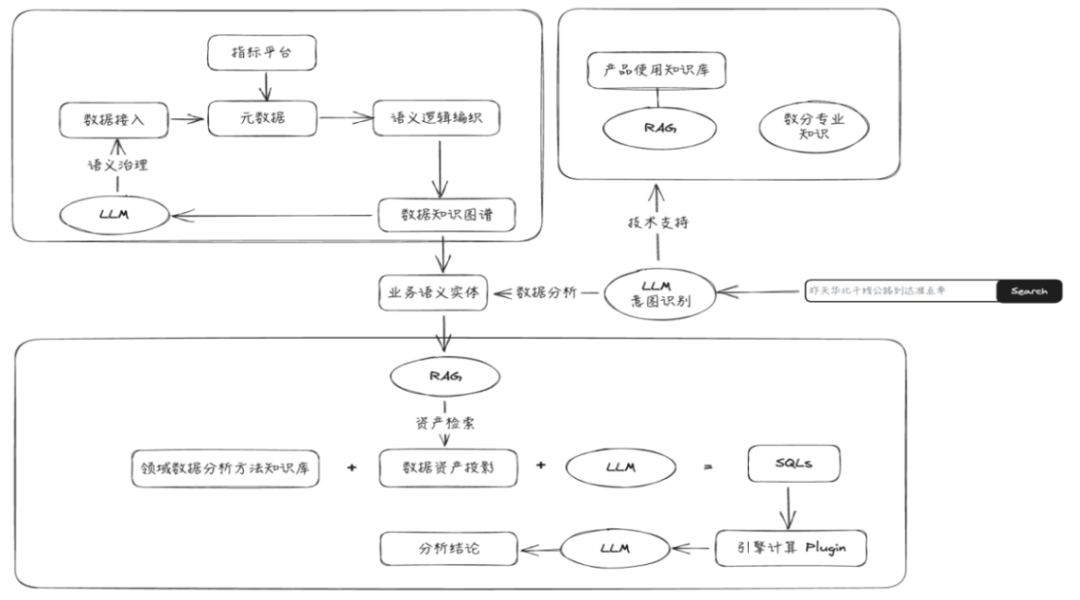 本方案在数据消费侧,形成了一套完整的数据分析智能体,以替代传统指标计算和报表制作;在数据供应侧,通过人工智能实现自动化的数据语义治理。