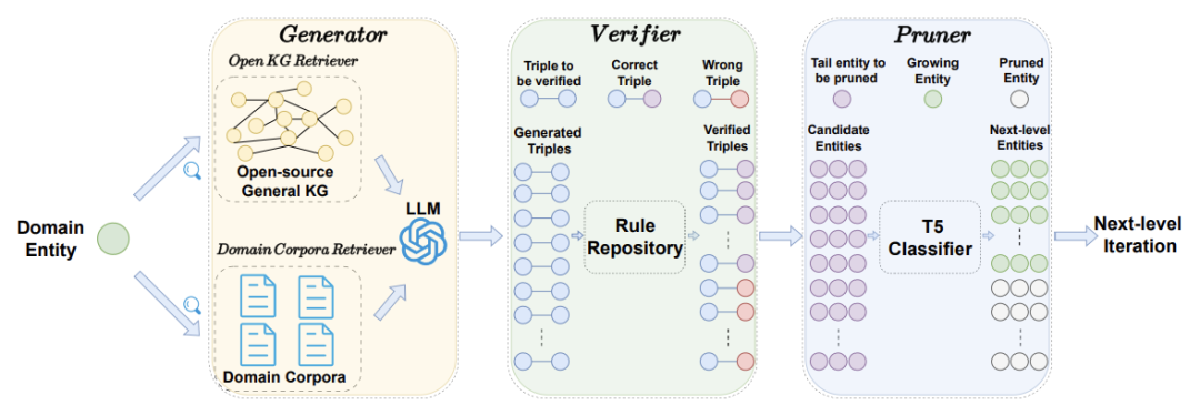 开创性地构建了一个专业级的、自动化的通用框架,旨在生成高水准的知识图谱(KG),这一框架的提出,标志着知识图谱构建技术的一大飞跃; 生成器技术有效地排除了在知识图谱构建过程中可能干扰 LLM 的上下文噪声,确保了构建过程的准确性和可靠性; 通过验证器和修改器的协同工作,成功地消除了 LLM 在知识图谱构建中常见的幻觉现象,进一步提升了知识图谱的质量和可信度。