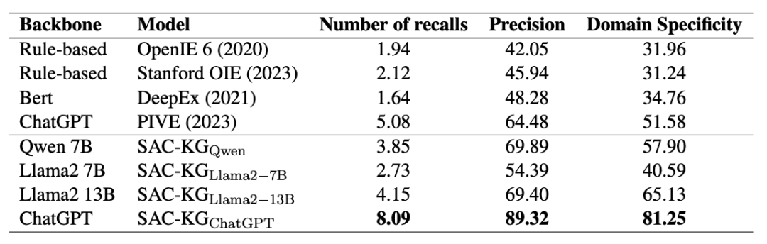 在下图中,展示了领域知识图谱(KG)在同一领域语料库上的性能评估,包括准确率、召回率以及领域特异性指标,以证明该方法的有效性。