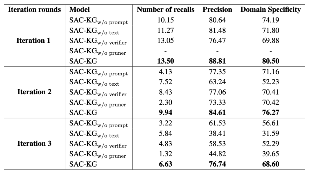 下图展示了在首个三层结构的知识图谱(KG)中,SAC-KG 框架的剪枝效果。每一次迭代都代表着知识图谱层次的扩展,而 “-” 符号则表示在第一次迭代时,修剪器尚未被应用。