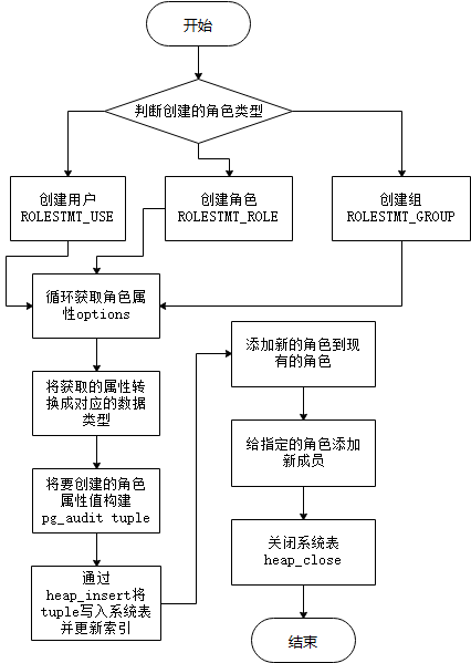 // 检查pg_authid relation,确认该角色没有存在.Relation pg_authid_rel = heap_open(AuthIdRelationId, RowExclusiveLock);TupleDesc pg_authid_dsc = RelationGetDescr(pg_authid_rel);if (OidIsValid(get_role_oid(stmt->role, true))) {str_reset(password);ereport(ERROR, (errcode(ERRCODE_DUPLICATE_OBJECT), errmsg("role \"%s\" already exists", stmt->role)));}……创建一个插入的tupleerrno_t errorno = memset_s(new_record, sizeof(new_record), 0, sizeof(new_record));securec_check(errorno, "\0", "\0");errorno = memset_s(new_record_nulls, sizeof(new_record_nulls), false, sizeof(new_record_nulls));securec_check(errorno, "\0", "\0");new_record[Anum_pg_authid_rolname - 1] = DirectFunctionCall1(namein, CStringGetDatum(stmt->role));new_record[Anum_pg_authid_rolsuper - 1] = BoolGetDatum(issuper);new_record[Anum_pg_authid_rolinherit - 1] = BoolGetDatum(inherit);new_record[Anum_pg_authid_rolcreaterole - 1] = BoolGetDatum(createrole);new_record[Anum_pg_authid_rolcreatedb - 1] = BoolGetDatum(createdb);new_record[Anum_pg_authid_rolcatupdate - 1] = BoolGetDatum(issuper);new_record[Anum_pg_authid_rolcanlogin - 1] = BoolGetDatum(canlogin);new_record[Anum_pg_authid_rolreplication - 1] = BoolGetDatum(isreplication);new_record[Anum_pg_authid_rolauditadmin - 1] = BoolGetDatum(isauditadmin);new_record[Anum_pg_authid_rolsystemadmin - 1] = BoolGetDatum(issystemadmin);new_record[Anum_pg_authid_rolconnlimit - 1] = Int32GetDatum(connlimit);……HeapTuple tuple = heap_form_tuple(pg_authid_dsc, new_record, new_record_nulls);if (u_sess->proc_cxt.IsBinaryUpgrade && OidIsValid(u_sess->upg_cxt.binary_upgrade_next_pg_authid_oid)) {HeapTupleSetOid(tuple, u_sess->upg_cxt.binary_upgrade_next_pg_authid_oid);u_sess->upg_cxt.binary_upgrade_next_pg_authid_oid = InvalidOid;}roleid = simple_heap_insert(pg_authid_rel, tuple);if (IsUnderPostmaster) {if (OidIsValid(rpoid) && (rpoid != DEFAULT_POOL_OID))recordDependencyOnRespool(AuthIdRelationId, roleid, rpoid);u_sess->wlm_cxt->wlmcatalog_update_user = true;}……