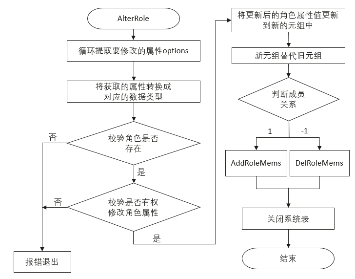 授予角色时,grantee_roles中的角色将被添加到granted_roles,调用函数AddRoleMems实现;回收角色时,将grantee_roles中的角色从granted_roles中删除,调用函数DelRoleMems实现。