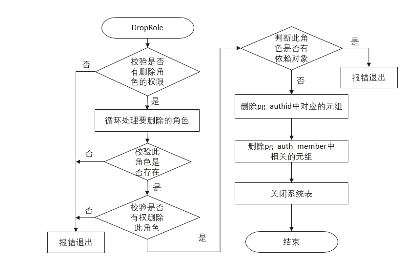 void DropRole(DropRoleStmt* stmt){. . .// 检查执行者是否有权限删除角色。if (!have_createrole_privilege())ereport(ERROR, (errcode(ERRCODE_INSUFFICIENT_PRIVILEGE), errmsg("Permission denied to drop role.")));// 循环处理要删除的角色。foreach (item, stmt->roles) {. . .// 检查要删除的角色是否存在,若不存在则提示报错。HeapTuple tuple = SearchSysCache1(AUTHNAME, PointerGetDatum(role));if (!HeapTupleIsValid(tuple)) {if (!stmt->missing_ok) {ereport(ERROR, (errcode(ERRCODE_UNDEFINED_OBJECT), errmsg("role \"%s\" does not exist", role)));} else {ereport(NOTICE, (errmsg("role \"%s\" does not exist, skipping", role)));}continue;}. . .// 当前用户不允许删除。if (roleid == GetUserId())ereport(ERROR, (errcode(ERRCODE_OBJECT_IN_USE), errmsg("current user cannot be dropped")));if (roleid == GetOuterUserId())ereport(ERROR, (errcode(ERRCODE_OBJECT_IN_USE), errmsg("current user cannot be dropped")));if (roleid == GetSessionUserId())ereport(ERROR, (errcode(ERRCODE_OBJECT_IN_USE), errmsg("session user cannot be dropped")));// 校验执行者和被删除角色的权限,如系统管理员才有权限删除其他系统管理员if((((Form_pg_authid)GETSTRUCT(tuple))->rolsuper|| ((Form_pg_authid)GETSTRUCT(tuple))->rolsystemadmin) &&!isRelSuperuser())ereport(ERROR,(errcode(ERRCODE_INSUFFICIENT_PRIVILEGE), errmsg("Permission denied.")));if ((((Form_pg_authid)GETSTRUCT(tuple))->rolauditadmin) &&g_instance.attr.attr_security.enablePrivilegesSeparate && !isRelSuperuser())ereport(ERROR, (errcode(ERRCODE_INSUFFICIENT_PRIVILEGE), errmsg("Permission denied.")));. . .// 针对CASCADE的情况,删除该角色拥有的对象。if (stmt->behavior == DROP_CASCADE) {char* user = NULL;CancelQuery(role);user = (char*)palloc(sizeof(char) * strlen(role) + 1);errno_t errorno = strncpy_s(user, strlen(role) + 1, role, strlen(role));securec_check(errorno, "\0", "\0");drop_objectstmt.behavior = stmt->behavior;drop_objectstmt.type = T_DropOwnedStmt;drop_objectstmt.roles = list_make1(makeString(user));DropOwnedObjects(&drop_objectstmt);list_free_deep(drop_objectstmt.roles);}// 检查是否有对象依赖于该角色,若还存在依赖,则提示报错。if (checkSharedDependencies(AuthIdRelationId, roleid, &detail, &detail_log))ereport(ERROR,(errcode(ERRCODE_DEPENDENT_OBJECTS_STILL_EXIST),errmsg("role \"%s\" cannot be dropped because some objects depend on it", role),errdetail_internal("%s", detail),errdetail_log("%s", detail_log)));// 从相关系统表中删除涉及待删除角色的元组。simple_heap_delete(pg_authid_rel, &tuple->t_self);. . .while (HeapTupleIsValid(tmp_tuple = systable_getnext(sscan))) {simple_heap_delete(pg_auth_members_rel, &tmp_tuple->t_self);}systable_endscan(sscan);DropAuthHistory(roleid);DropUserStatus(roleid);DeleteSharedComments(roleid, AuthIdRelationId);DeleteSharedSecurityLabel(roleid, AuthIdRelationId);DropSetting(InvalidOid, roleid);. . .heap_close(pg_auth_members_rel, NoLock);heap_close(pg_authid_rel, NoLock);}