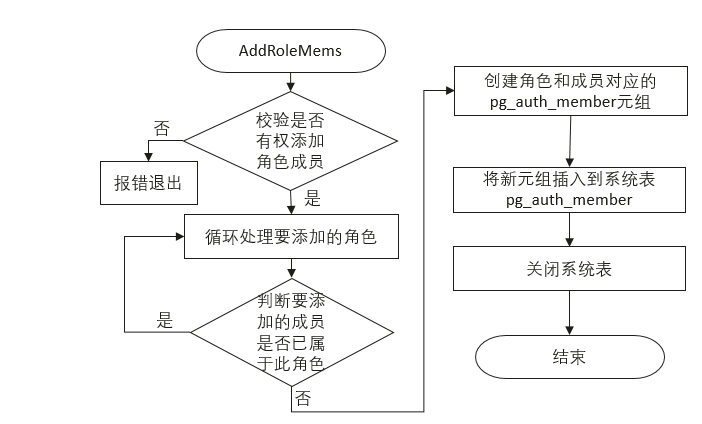 static void AddRoleMems(const char* rolename, Oid roleid, const List* memberNames, List* memberIds, Oid grantorId, bool admin_opt){. . .// 校验执行者的权限。if (superuser_arg(roleid)) {if (!isRelSuperuser())ereport(ERROR, (errcode(ERRCODE_INSUFFICIENT_PRIVILEGE), errmsg("Permission denied.")));. . .}. . .if (grantorId != GetUserId() && !superuser())ereport(ERROR, (errcode(ERRCODE_INSUFFICIENT_PRIVILEGE), errmsg("must be system admin to set grantor")));// 循环处理要添加的角色。pg_authmem_rel = heap_open(AuthMemRelationId, RowExclusiveLock);pg_authmem_dsc = RelationGetDescr(pg_authmem_rel);forboth(nameitem, memberNames, iditem, memberIds){// 针对角色和成员信息创建pg_auth_members元组,再将新元组插入到系统表中。. . .new_record[Anum_pg_auth_members_roleid - 1] = ObjectIdGetDatum(roleid);new_record[Anum_pg_auth_members_member -1] = ObjectIdGetDatum(memberid);new_record[Anum_pg_auth_members_grantor - 1] = ObjectIdGetDatum(grantorId);new_record[Anum_pg_auth_members_admin_option - 1] = BoolGetDatum(admin_opt);if (HeapTupleIsValid(authmem_tuple)) {new_record_repl[Anum_pg_auth_members_grantor - 1] = true;new_record_repl[Anum_pg_auth_members_admin_option - 1] = true;tuple = heap_modify_tuple(authmem_tuple, pg_authmem_dsc, new_record, new_record_nulls, new_record_repl);simple_heap_update(pg_authmem_rel, &tuple->t_self, tuple);CatalogUpdateIndexes(pg_authmem_rel, tuple);ReleaseSysCache(authmem_tuple);} else {tuple = heap_form_tuple(pg_authmem_dsc, new_record, new_record_nulls);(void)simple_heap_insert(pg_authmem_rel, tuple);CatalogUpdateIndexes(pg_authmem_rel, tuple);}}. . .heap_close(pg_authmem_rel, NoLock);}