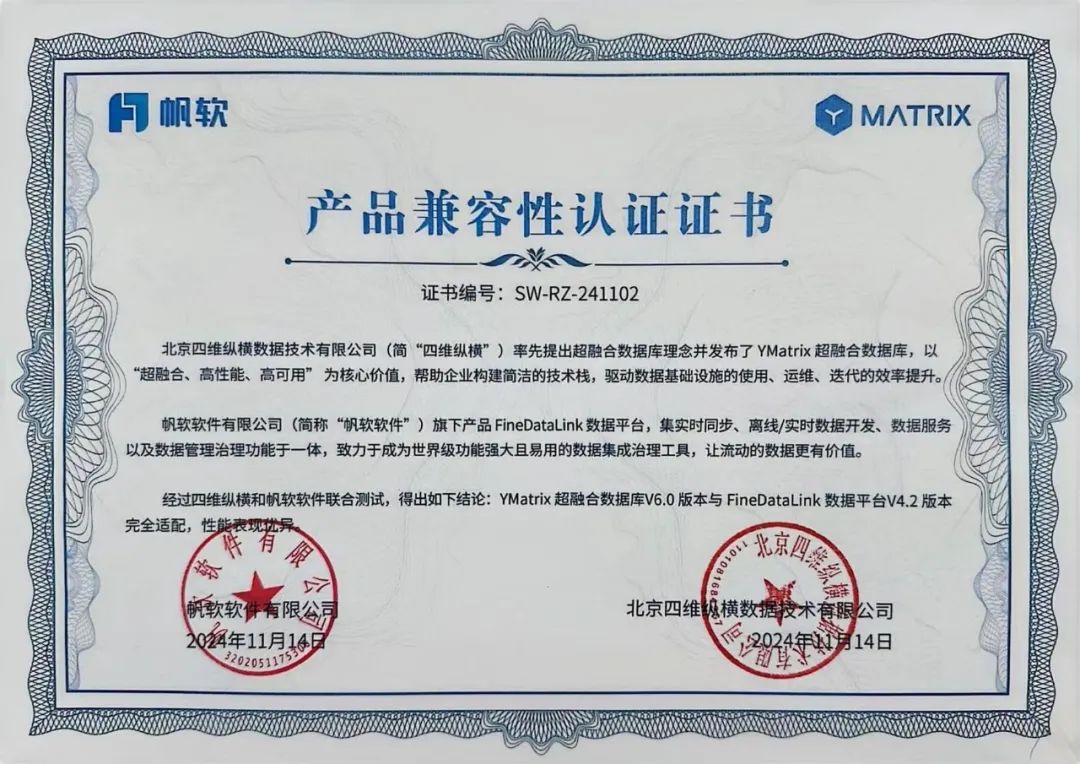 近期,四维纵横(YMatrix)与帆软软件有限公司顺利完成产品兼容性互认证。经过联合测试,YMatrix 超融合数据库 V6 版本与 FineDataLink 数据库平台 V4.2 版本完成适配,对双方的技术合作迈出了重要一步。这一认证标志着双方在数据生态合作上的又一重要里程碑。