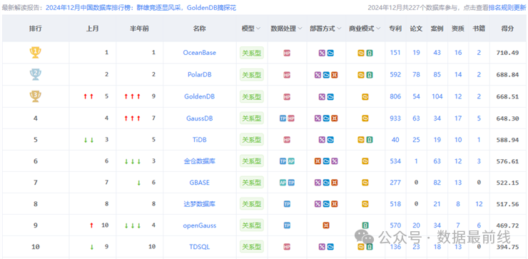 自23年10月开始,第一名的宝座被阿里系的OceanBase和PolarDB持续霸榜,OceanBase更是从24年7月份一直待在榜首,除GoldenDB排名大幅上升之外,其他的变化都不大,头部效应非常明显。