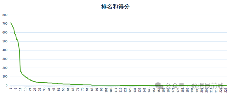排名第一的OceanBase得分达到710分,前4名基本都是20分的差距,之后的分值差距逐渐加大,第10名之后的得分呈断崖式下降趋势,从75名之后得分都在个位数,最后几名的得分甚至是0,几乎没有什么存在感。