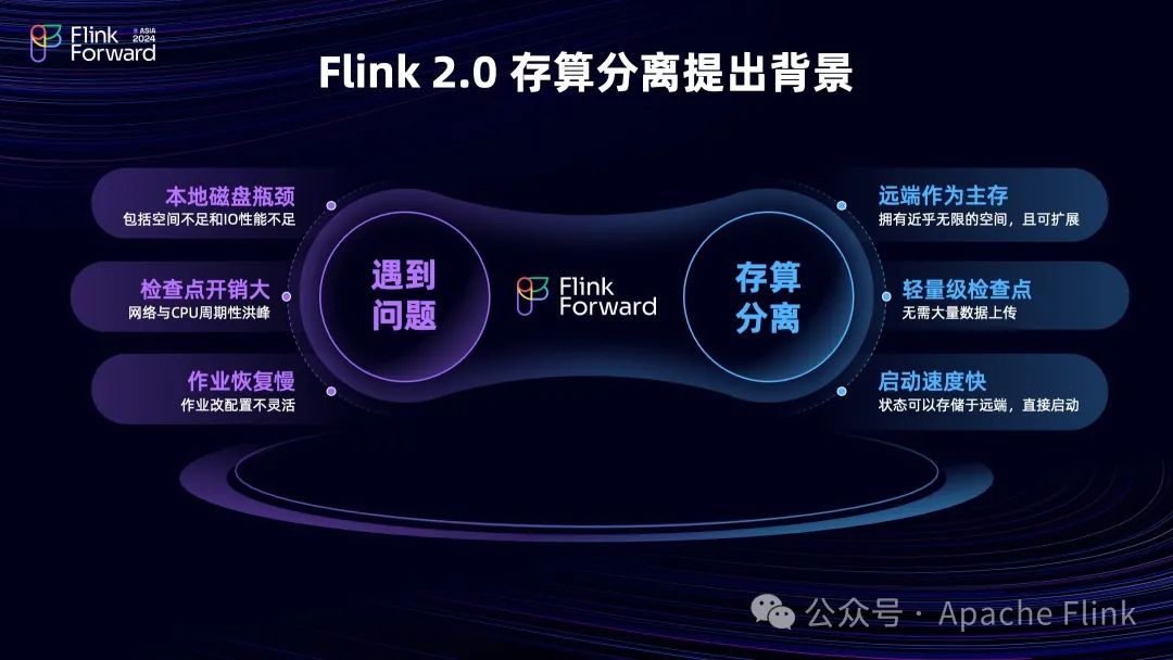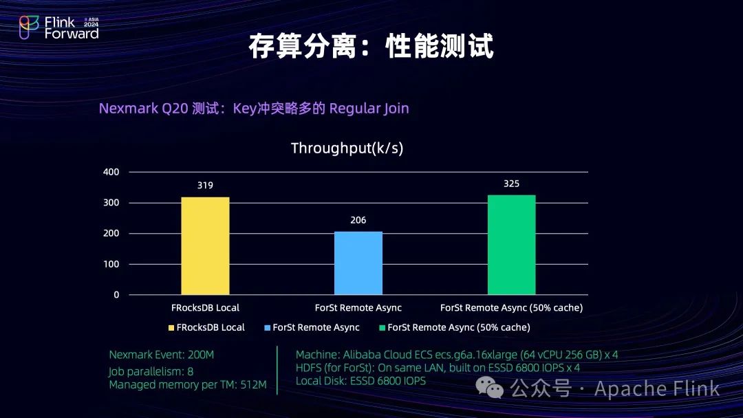 存算分离的架构可以有效解决上述问题。第一,通过将远程存储作为主存,可以避免本地端存在的限制问题。远程存储可以灵活扩展 I/O 性能和内存容量,且成本相对较低。第二,检查点操作可以变得更加轻量,因为状态数据已经存储在远程,无需再进行上传。第三点也是最为关键的一点,启动速度可以显著提升。因为存算分离模式下支持文件在远端时直接启动,无需进行繁琐的下载过程。这使得 Flink 真正拥抱云原生生态,可以快速地进行扩缩容,满足流量变化需求。