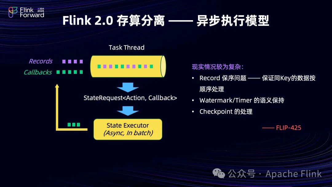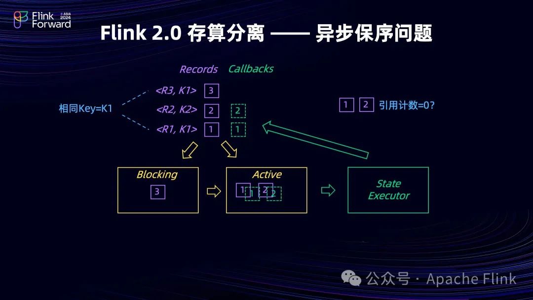 存算分离在 Flink 2.0 上主要有三部分工作。第一部分是支持状态存储于远端。当状态数据直接存储于远端时,面临的最大挑战是性能会显著下降,下降幅度可能达到十倍甚至上百倍。为了应对这一挑战,我们第二部分工作是引入了异步化的处理方法,即利用异步线程来执行 I/O 操作,从而有效提升系统吞吐能力。第三点则是关于实现快速的检查点及恢复机制。在社区中,我们提出了许多 FLIP(Flink Improvement Proposal)以推进存算分离。首先,FLIP-423 是一个总纲性的 FLIP,介绍了整体路线。FLIP-424 针对当前的 State API 提出了改动方案,旨在将同步化的 State API 转变为异步化。紧接着 FLIP-425 提出了异步化的执行模型,并对状态访问过程进行了优化。更进一步,FLIP-426 通过将异步状态请求进行批处理来优化。为了支持远端存储的写入过程,FLIP-427 引入了一个全新的内核机制。由于执行已经异步化,检查点的过程可能会变得更为复杂,因为需要处理异步化的相关逻辑。FLIP-455 专门针对这一场景进行了优化。最终,所有的 SQL 操作算子(operator)都将使用新的异步化 State API 进行实现(FLIP-473)。这样 SQL 用户无需改动他们的代码,就可以享受到存算分离以及异步化所带来的性能提升和优势。在Flink 1.x版本中,State API 是同步的。以上图中左上角的 WordCount 示例作业为例,程序首先读取当前的 count 值,然后对其进行加一操作并更新回状态,最后将结果发送到下游。在这个模型中,每个并发任务都是一个单线程执行的,因此在读取当前值时,线程会被阻塞,无法处理其他任务。为了改进这一点我们将 State API 改为异步的。具体来说,用户可以发送一个异步请求(asyncValue)来获取状态的值,并提供一个回调函数(callback)。当获取到结果后,用户可以在这个回调函数中执行所需的操作,例如在示例中的 thenCompose 部分进行加一和更新操作,之后结果会被发送到下游。这就是异步API的工作方式。同时我们也保留了同步API的支持以便用户可以根据需要选择使用。然而需要注意的是,异步API和同步API混合使用时的性能并不能达到最优。因为同步API具有阻塞特性,会阻塞等待结果返回后再继续执行。使用异步API进行状态访问时的执行流程如下所述。首先,Task 线程作为单线程模型的核心,持续不断地执行用户的代码。它对于输入数据仍然采用串联的方式进行处理。当用户需要进行状态访问时,这一操作会被抽象为一个状态请求(StateRequest)描述符,包含了要执行的动作(Action),比如查询某个 Key 的值或更新某个 Value。此外还包含一个用户提供的回调函数。Task 线程会将所有的请求收集起来,一并发送给 State Executor 执行层。一旦发送,Task 线程会立即返回继续处理其他任务。State Executor 则负责异步执行这些请求。执行完成后,执行层会将结果和对应的回调打包,并放入 Task 线程的等待队列中。Task 线程随后会按顺序执行这些回调函数。在空闲时,Task 线程会继续接收并处理新的输入数据。由于回调函数中可能有后续的状态访问,会产生新的状态请求,因此这形成了一个循环过程。这个过程会一直持续,直到不再产生新的请求为止。这是一个事件驱动的模型。然而在实际应用中我们会遇到许多挑战。首先是数据处理的保序问题。对于具有相同 Key 的数据,它们访问的是同一个 Key 下的状态值。这在顺序执行时没有问题。但在乱序执行时,由于数据的处理不是一个原子操作(先读后写),当不同数据处于不同执行阶段时,就可能会引发脏读幻写等问题。因此我们需要确保相同 Key 的数据按顺序处理。其次以水位线(Watermark)为例,它作为一种特殊的输入,会触发水位上升并因此激活一些定时器(Timer),Timer的处理也涉及到一些状态访问。如果前序的 Record 还在异步访问状态时,就收到了水位上升的信号,此时的行为是不符合水位的定义的。最后还有检查点的处理问题。当触发检查点时可能还有一些状态请求或回调正在执行中,需要有一个策略来保证 Exactly once 的语义。以上这些问题在 FLIP-425 中都有详细的讨论和解决方案,下面我们以保序问题为例简要阐述一下异步带来的实现复杂度。当一个 Task 接收到输入,如输入 Record 1、2、3时,其内部执行模型会根据 Record 中的 Key 对它们进行分类处理。对于每个 Key,执行层确保在同一时间内只有一个 Record 处于执行状态。如果后续有相同 Key 的 Record 到来,它们会被放入一个阻塞队列中等待。对于可以立即执行的 Record,它们会被攒批后发送到 State Executor 中进行处理。处理完成后,会触发相应的回调函数。这个回调函数可能会继续产生新的状态请求,从而形成一个循环处理过程。为了确定何时可以处理完所有被阻塞的 Record,执行层采用了一个引用计数的方式来跟踪每个 Key 的活跃请求数量。当引用计数降为零,即表示没有任何与该 Key 相关的活跃请求时,被阻塞的 Record 就会被从阻塞队列中取出,放入活动队列中等待执行。这样通过引用计数和阻塞队列的结合使用,执行层能够确保每个 Record 都按照正确的顺序和条件得到处理。在 State Executor 中线程被明确区分为不同的用途。具体而言,仅有一个写线程负责写入操作,而多个读线程则负责读取操作。写线程在写入时采用批量处理的方式,即先将数据累积到一定量后再进行写入。读线程在读取数据时,也会根据情况选择批量读取(MultiGet)或逐个读取(单个Ge