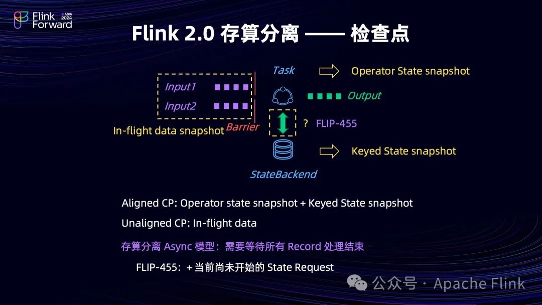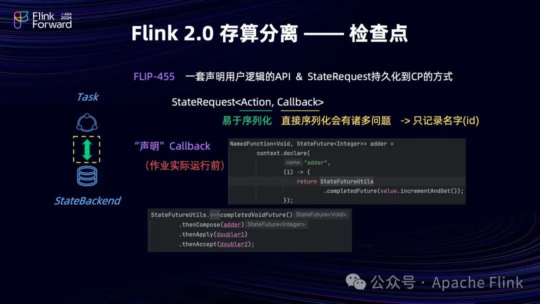 Unaligned Checkpoint 的优势在于其速度非常快,因为它不受数据处理速度的限制。然而在引入存算分离后,这个问题可能变得更加复杂。无论触发哪种类型的检查点,触发检查点之后,仍可能存在尚未完成的状态请求或等待执行的回调。在 Task 与状态后端交互的过程中,是无法进行检查点的。因此最通常的做法是等待所有交互完成后,再进行 Aligned 或 Unaligned Checkpoint。然而在 Unaligned Checkpoint 的情况下,如果仍然需要等待输入数据处理完成,那么就会降低其速度优势。于是我们提出了 FLIP-455 来解决这个问题。FLIP-455 主要针对那些尚未开始的状态请求,将这些尚未开始的请求也纳入检查点中,并在恢复时重新运行它们。这样一来就无需等待这些请求完成,从而提高了Unaligned Checkpoint 的整体速度。FLIP-455 分为两方面内容。一方面提供了一套用于定义用户逻辑的 API,另一方面支持将状态请求持久化到检查点中。