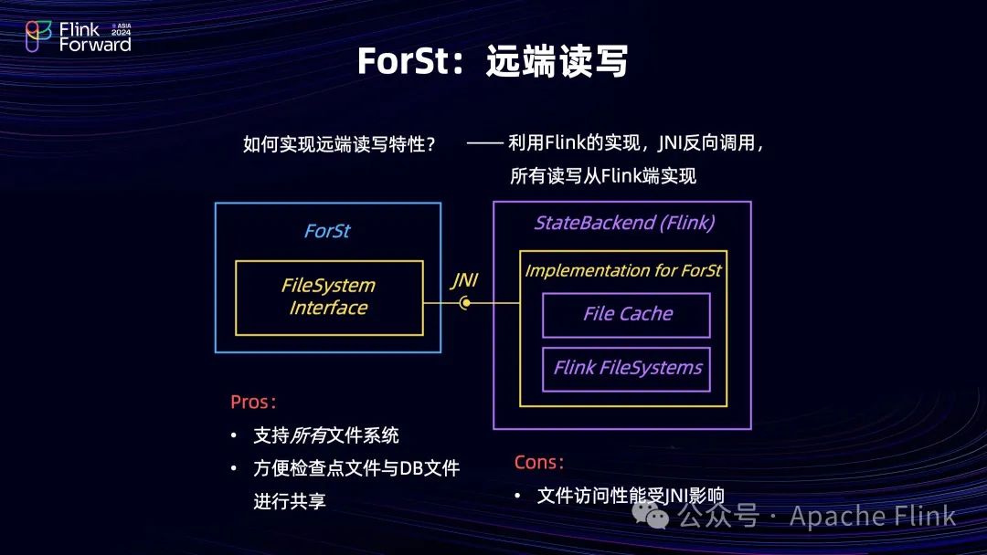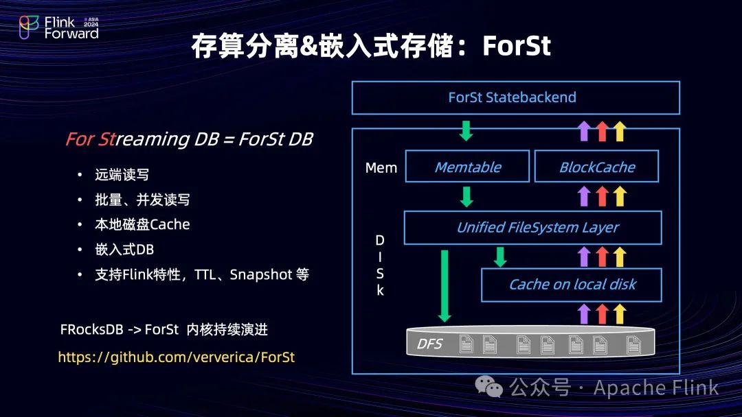 首先让我们思考如何将状态请求持久化到检查点中,它涉及两个部分。第一部分是关于用户需要执行哪种请求的持久化,包括访问哪个状态以及一些输入(如Key等)。由于状态本身有唯一标识符,相关输入也有现成的序列化器,这一部分的持久化是相对容易的。然而另一部分是用户回调的序列化,这复杂得多。虽然回调本身理论上是可以被直接序列化,但实际操作中会遇到诸多问题。用户通常会使用 lambda 表达式或匿名类来定义回调,而匿名类在跨 JVM 执行时可能会引发潜在问题。此外用户定义的回调表达式中可能隐藏着一些 bug,例如除零错误或空指针异常(NullPointerException)。在恢复过程中,由于回调的内容会被原封不动地恢复,用户无法修正他们的回调,因此无法绕过错误的执行,导致整个作业无法正常运行。这是一个相当严重的问题。为了解决这个问题,我们采取了一种替代方案:为每一个回调提供一个唯一标识符,在检查点中只记录标识符,在恢复时根据为每个标识符重新定义一个与原来功能相同的回调,并将其重新分配给对应的状态请求。为了完成这一点,我们需要引入一套新的API供用户声明并创建他们的回调,这就是我们所谓的声明用户逻辑的API。如图上示例所示,用户在定义回调时可以提供一个名字,当然这个名字可以省略并由系统自动生成。声明之后这个回调具备了唯一标识符并且可以在检查点的时候被持久化,通过这种方式,我们可以支持在 Unaligned Checkpoint 下快速进行检查点操作,同时确保回调的正确性和可执行性。接下来我们详细介绍一下为存算分离而引入的新内核—ForSt DB,一个为流计算场景设计的存算分离且 embedded 的 Key-value 存储内核。ForSt DB,其命名灵感源自“For Streaming DB”,核心改动是引入了一层统一文件管理层(Unified FileSystem Layer)。这一层掩盖了底层复杂的存储结构,无论是本地磁盘、分布式文件系统(DFS)还是缓存(Cache),都能被统一管理和访问。因此,ForSt DB 内核能够轻松地访问远端存储,并在需要时利用本地磁盘作为缓存以提升性能。ForSt 具备一系列特性,如远端读写能力、批量并发读写优化、本地磁盘缓存机制以及嵌入式功能等,这些都使其在处理数据流方面表现出色。它依然依赖于 Task Manager(TM) 进行存活管理,并且支持 Flink 的某些特性,如 TTL(Time To Live,状态生存时间)和快照等。实际上,ForSt 起源于 FRocksDB,后者是社区基于 RocksDB 实现的状态后端内核。现在,ForSt 已经发展成为一个新的项目,在原有内核的基础上进行了一系列改动,这些改动使得它与之前的版本有了较大的区别。ForSt 的内核将持续演进以满足不断变化的需求。ForSt 目前已经开源(https://github.com/ververica/ForSt),欢迎各位开发者使用和改进。
