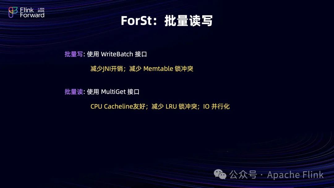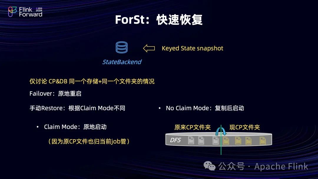ForSt 最为关键的功能在于它支持远端读写。我们在 ForSt 内部定义了一个统一的文件系统接口,所有的文件操作都通过这个接口来进行。这个接口具备高度的灵活性,我们可以针对多种不同的存储系统实现相应的接口,比如HDFS、OSS、S3等。为了快速构建并验证整个系统链路,在与 Flink 集成的 ForSt 实现中,我们充分利用了 Flink 已经支持的多种文件系统实现,使用 Flink 中的文件系统接口来实现 ForSt 定义的文件系统接口,通过 JNI 来将二者连接起来。这样做的好处是显而易见的:Flink 支持哪些文件系统,ForSt 就能支持哪些文件系统,无需重复开发。此外,由于实际的文件系统实现位于 Flink 端,也为后续的一些功能开发带来了便利。例如我们可以方便地实现检查点和存储内核文件之间的共享,从而实现轻量级的检查点功能。当然,由于中间需要经过一层 JNI 的调用,文件访问性能可能会受到一定影响。但这种影响主要体现在 CPU 开销上,与 I/O 访问延迟相比其影响相对较小。ForSt 支持批量读写功能,这一特性源自 RocksDB。ForSt 继承了 RocksDB 中的一些关键接口,如用于批量写的 WriteBatch 接口和用于批量读的 MultiGet 接口。通过实际测试,我们验证了这些接口能够带来的显著性能提升,包括但不限于提高数据处理的吞吐量、降低延迟以及优化资源利用率。接下来我们探讨如何实现快速检查点。在这里我们只探讨增量检查点的情况。现实情况中用户可以针对作业随意设置检查点文件与存算分离内核SST文件(下称内核文件)的目录。我们考虑一个理想的场景:检查点文件和内核文件位于相同的存储介质上,并且存放在相同的文件夹内。这是最为便捷的情况,也是系统默认的配置。此时内核文件可以直接被检查点使用,无需额外的复制或移动操作。这里存在一个文件所有权的问题:对于检查点而言,文件的所有者是 JobManager(JM);而对于内核文件的所有者是TM。由于文件本身不需要移动和拷贝,在做检查点时系统只需执行一个简单的文件移交操作:在创建检查点时,将所需的SST文件全部标记为检查点文件。已经标记好的检查点文件即使 ForSt 认为不在需要也不会立即删除,而是使得 JM 根据检查点文件的生命周期来进行删除。唯一需要考虑的是如果 ForSt 仍然需要某个文件,是否会被 JM 提前删除?这里由于采用了增量检查点机制,JM 只会在确认下一个检查点不再需要该文件后才进行删除。这意味着如果下一个检查点不包含某个文件,那么 ForSt 实际上已经不再需要它了,因此上述问题是不存在的。接下来是第二种场景:检查点与内核虽然使用相同的存储介质,但存放在不同的文件夹内的情况。此时我们需要将内核的文件复制到检查点文件夹内。这个过程可以采纳 Flink 社区中的 PathsCopying 接口,即远端快速拷贝功能,由存储介质自行完成快速拷贝(而不用执行读取&写入的过程)。最后是第三种场景:检查点与内核使用完全不同的存储介质,例如内核使用本地存储,而检查点使用远端存储的情况。此时我们只能采取慢拷贝的方式,即将文件从本地存储传输到远端存储。接下来我们来探讨一下快速恢复的问题。我们先着眼于统一存储环境下的相关问题。在最佳情况下,即发生 Failover(故障转移)时,系统可以直接在原地重启,无需进行额外的操作。针对手动作业恢复的情况会更复杂些。这是在指停止服务后,再重新启动服务,此过程中不改变并发度,但可以调整其他配置。根据恢复时选择的如何处理之前检查点文件的模式的不同,恢复行为也会有所差异。如果采用的是 Claim Mode,那么可以直接启动服务,因为文件实际上仍然是由 JM 进行管理的,后续增量检查点仍然可以以这些现存的检查点为基础而增量做。这种情况仍然可以让 ForSt 重复使用之前的检查点文件,避免拷贝与下载。如果采用的是 No Claim Mode,之前的检查点文件不归当前 JM 管理,故并不能被视为可靠的。因此在恢复服务之前,我们需要将这些文件拷贝出来。这个拷贝过程同样可以由存储介质进行快速拷贝操作。针对修改并发度场景下的快速恢复会更加复杂。目前 Rescale 过程主要通过 ClipDB 和 IngestDB 两个流程来实现。ClipDB 流程相当于按需对一个内核所需的 SST 文件进行快速裁剪的过程。由于 SST 文件以及内部存储的 Key 是按照键值分片号(Key group)作为排序前缀,那么在状态重新分配时,每个并发可以根据分片号范围来进行状态裁剪。例如上图所示,如果只需要使用到10-19号分片的文件,那么 ClipDB 就会生成一个新的、只包含这些分片的文件的 ForSt 实例。而 IngestDB 流程则是将多个 ForSt 实例合并成一个。这种合并的好处在于能够最小化文件写入操作。以之前的例子为例,在 Rescale 过程中,只有紫色的文件会被重写,而其他文件则保持不变。通过这两个流程配合,ForSt 能够高效地实现状态后端的恢复,同时对于不需要更改的文件,仍能够以最大限度的在远端重用。3.1 存算分离:Preview 版本与 2.0 进展在十月份发布的 Flink 2.0 Preview 版本中,我们发布了相应的 ForSt 内核版本,完成新的 State API 以及异步执行模型等相关功能。在 SQL 方面我们完成了 Regular Join 算子的异步化改写。目前读写链路上已经全面完成,纯远端访问的性能也符合预期。关于即将发布的 2.0 版本,将包含以下功能特性:快速检查点恢复的功能,但需要注意的是,FLIP-455 中提出的对异步优化的检查