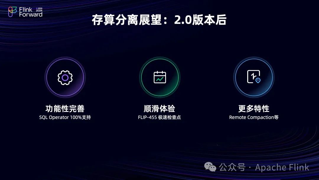 在 Flink 2.0 发布之后我们还将继续进行迭代。在 SQL Operator 方面,我们将继续完善其支持,力求达到百分之百的算子全部有异步优化实现。同时我们会继续实现 FLIP-455 提出的更快速的检查点机制。存储内核方面也会支持更多特性,比如 Remote Compaction(远端压缩)等功能。对于 ForSt 内核,我们希望增强其对流特性的支持。根据社区内呼声较高的用户痛点以及我们的生产经验,我们规划了很多后续优化点,它们将会在未来逐一引入: