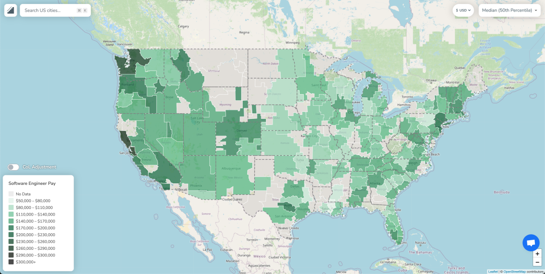 网站支持搜索城市(左上角)、调整查询的百分位数(如中位数 P50、薪资较低的 P10、薪资较高的 P90)。按照年薪或月薪呈现均可。
