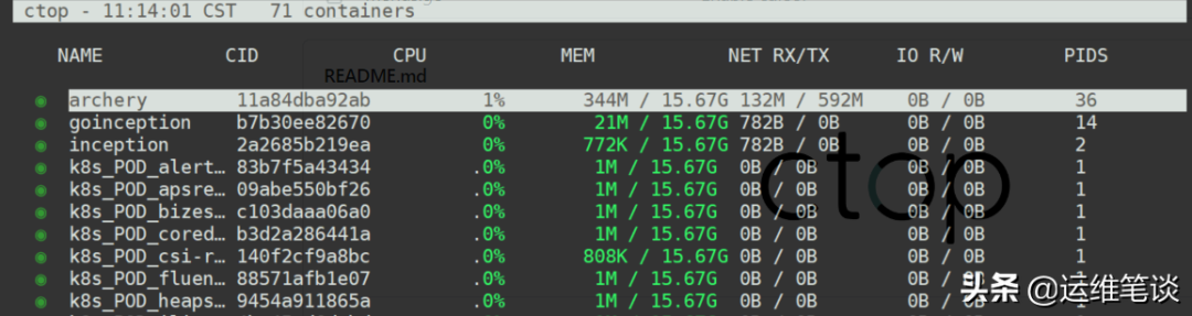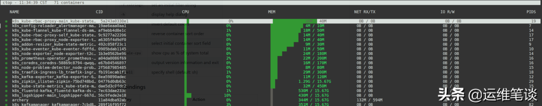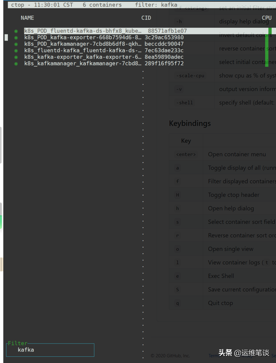 ctop -hctop - interactive container viewerusage: ctop [options]options:-a show active containers only #只查当前活动的容器-connector stringcontainer connector to use (default "docker")-f string # 搜索容器,比如包含kafka前缀的容器名filter containers-h display this help dialog # 帮助信息-i invert default colors # 翻转当前终端颜色-r reverse container sort order # 排序,可以选择cpu,内存,状态等信息-s stringselect container sort field # 反排序-scale-cpushow cpu as % of system total # cpu百分比-shell stringdefault shell-v output version information and exit