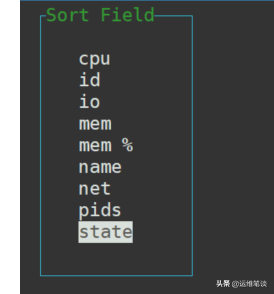 3、s 选择容器排序的字段,排序字段包含cpu,io,mem,mem %,name,pids,net,state