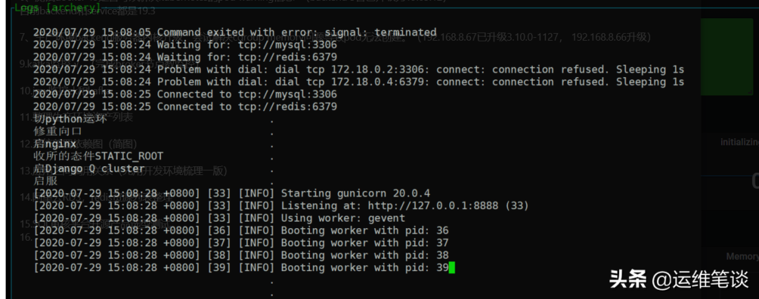 4、l 查看容器的日志,如下图查看容器名 archery的日志