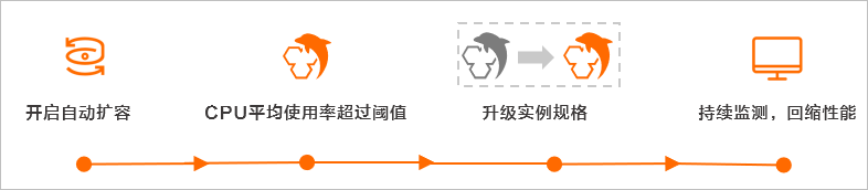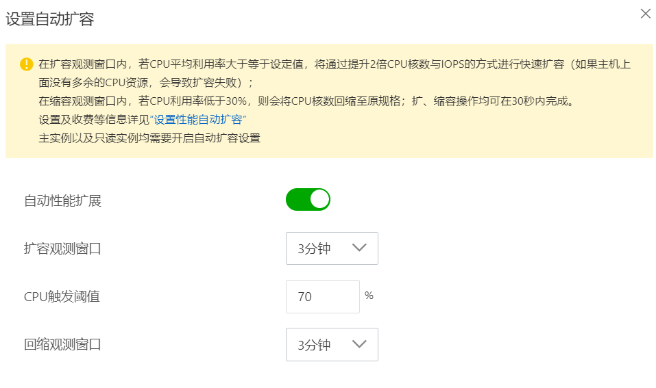 阿里云RDS的自动性能扩展功能,它可以在扩容观测窗口内,若CPU平均利用率大于等于设定值,可以提升2倍CPU核数与IOPS。