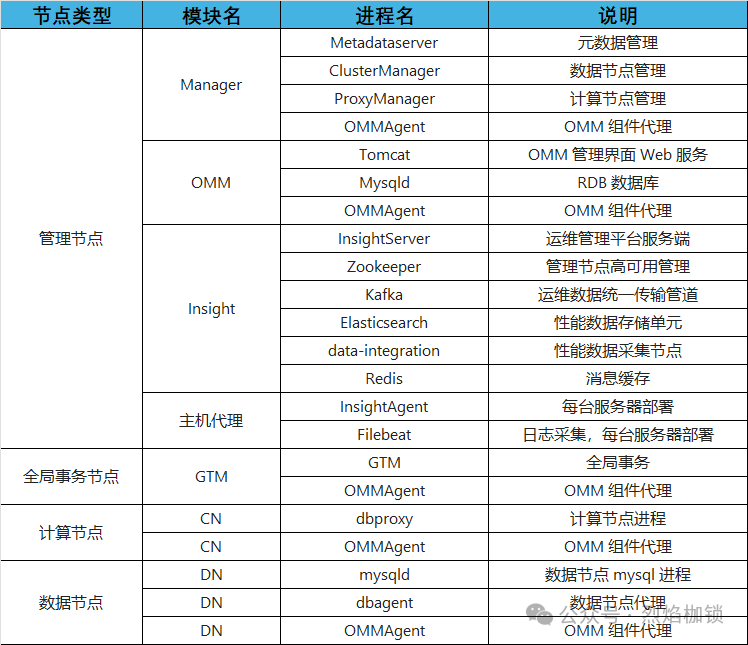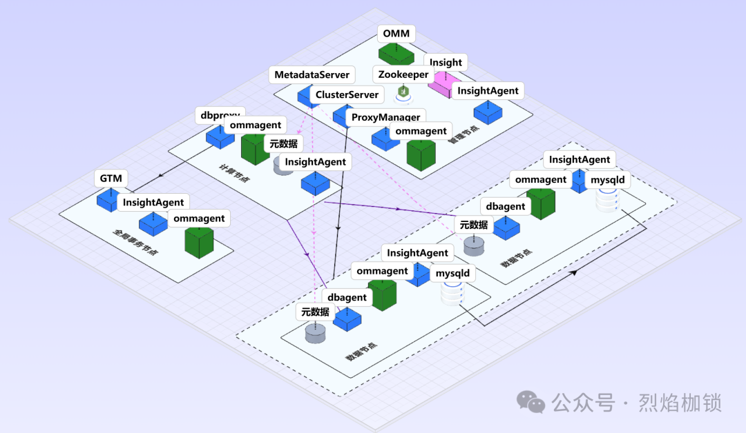 计算节点和数据节点之间通过dbagent通讯; 分片之间通过mysql的binlog同步复制; 事务访问计算节点,如果需要申请全局事务ID,会通过GTM管理节点申请GTID; ClusterManager统一管理数据节点; ProxyManager对计算节点进行统一管理; Metadataserver管理各节点的元数据信息; 每台服务器会部署ommagent,执行OMM下发的命令(新版本将取消该部分组件); InsightAgent是主机代理,每台主机上部署,执行insightserver下发的命令,收集数据。