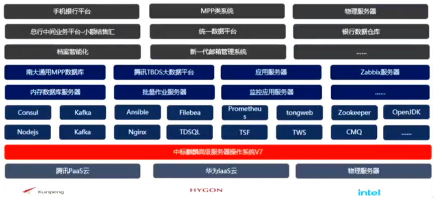 Linux服务器操作系统,开展基于中标麒麟V7的全面测试,2020年5月对用户已完成多个国产化应用的投产试点,包括大数据服务云、电子公文、对公理财等业务。
